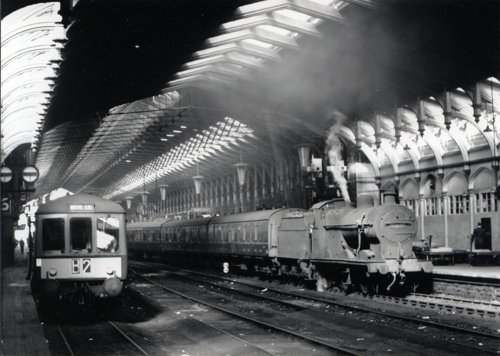 Moving inside the fine 1840 train shed on 23 April 1963 we witness BR 75001 aiding a diseased DMU near Old Station Signal Box. This closed on 12 September 1965 when all these trains were taken out of use. The listed building remains, but ineptly used as a car park.