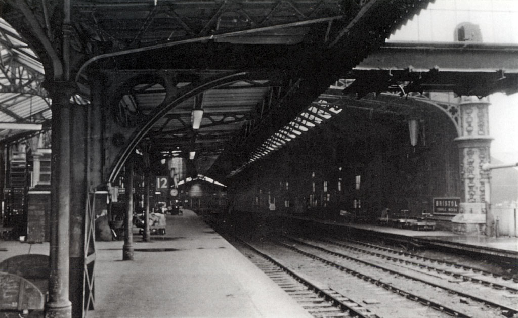 The original train shed remained in use until 12 September 1965 and is seen here on 10 September 1960 after arrival from Gloucester behind 4-6-0 44804. The back of the train is at platform 12 and the front at 13. In the 1880s these has been departure platforms for the Midlands and South Wales respectively. There were two berthing roads in the centre, with platforms 14 and 15 against the north wall. The building is now used mainly for car parking and is Listed Grade 1. The "Empire and Commonwealth" exhibition opened in part of it in September 2002.
